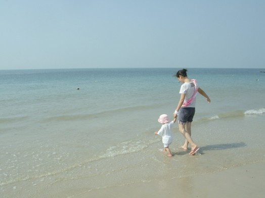 海灘上留下了無(wú)數(shù)指尖大小的小孔隙,出于好奇,我蹲下來(lái)靜靜地觀(guān)察,發(fā)現(xiàn)有小小的螃蟹從小孔隙里爬出來(lái),象我一樣好好沐浴燦爛陽(yáng)光、溫暖海風(fēng);有些頂著米粒大的沙團(tuán)推出小孔隙,原來(lái)是小螃蟹寶寶在造穴,多勤勞呀,從小就養(yǎng)成了愛(ài)勞動(dòng)的習(xí)慣;最好玩的是好不容易逮著一只螃蟹寶寶放在手心任其橫行霸道,直癢得我開(kāi)懷大笑……..
