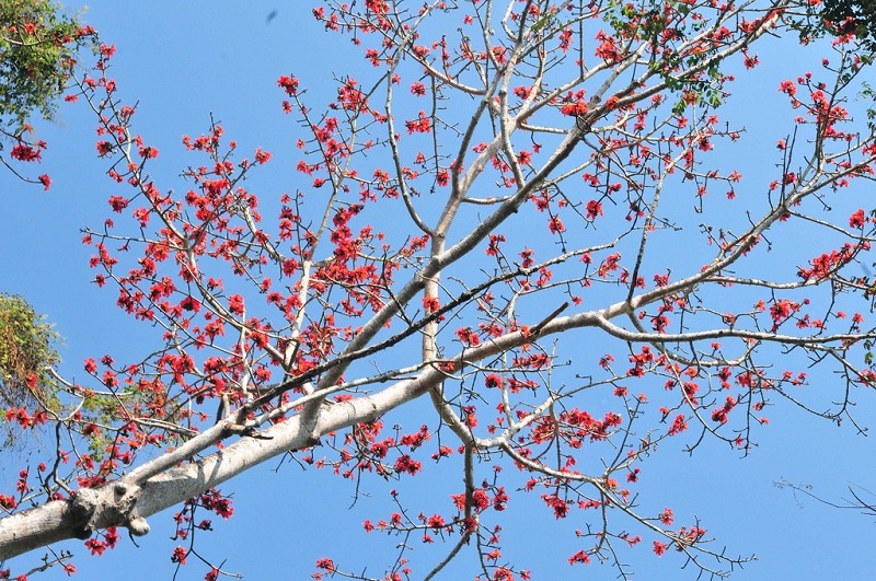 咦,春天來了。這粗糙且?guī)Я龃痰能|干,干枯的樹枝,雖然挺拔,但總歸突顯蒼老。不曾想,這毫不起眼的枯樹,卻在這春意盎然的雨天,綻放出火焰般的生命,這突如其來的綻放似那騰空而起的煙花,一樣的耀眼卻不一樣的安靜。駐足凝視,這碗大的花朵,恰似染紅的羽毛球,五片擁有強(qiáng)勁曲線的花瓣,包圍一束綿密的黃色花蕊,收束于緊實(shí)的花托。此花素而不艷、嫩而不嬌、爽而不躁,撩我心弦,卻道不出為何花。心動(dòng)而好奇,好奇而愕然。路人甲“哎,那是木棉花,英雄花”。驚愕,卻也高興,雖不識(shí)廬山,但總歸能為其巍峨、壯麗而吸引。