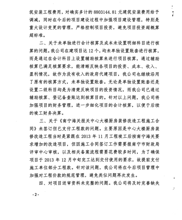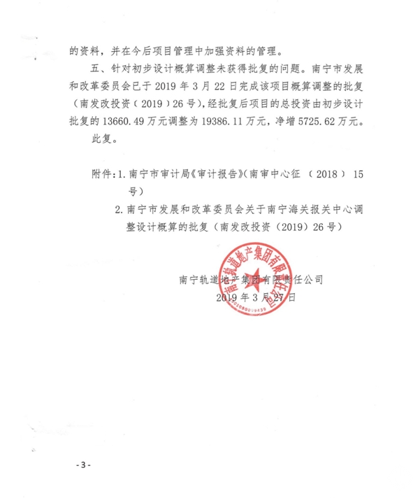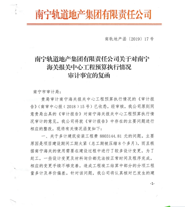 南寧軌道地產集團有限責任公司關于對南寧海關報關中心工程預算執(zhí)行情況審計事宜的復函